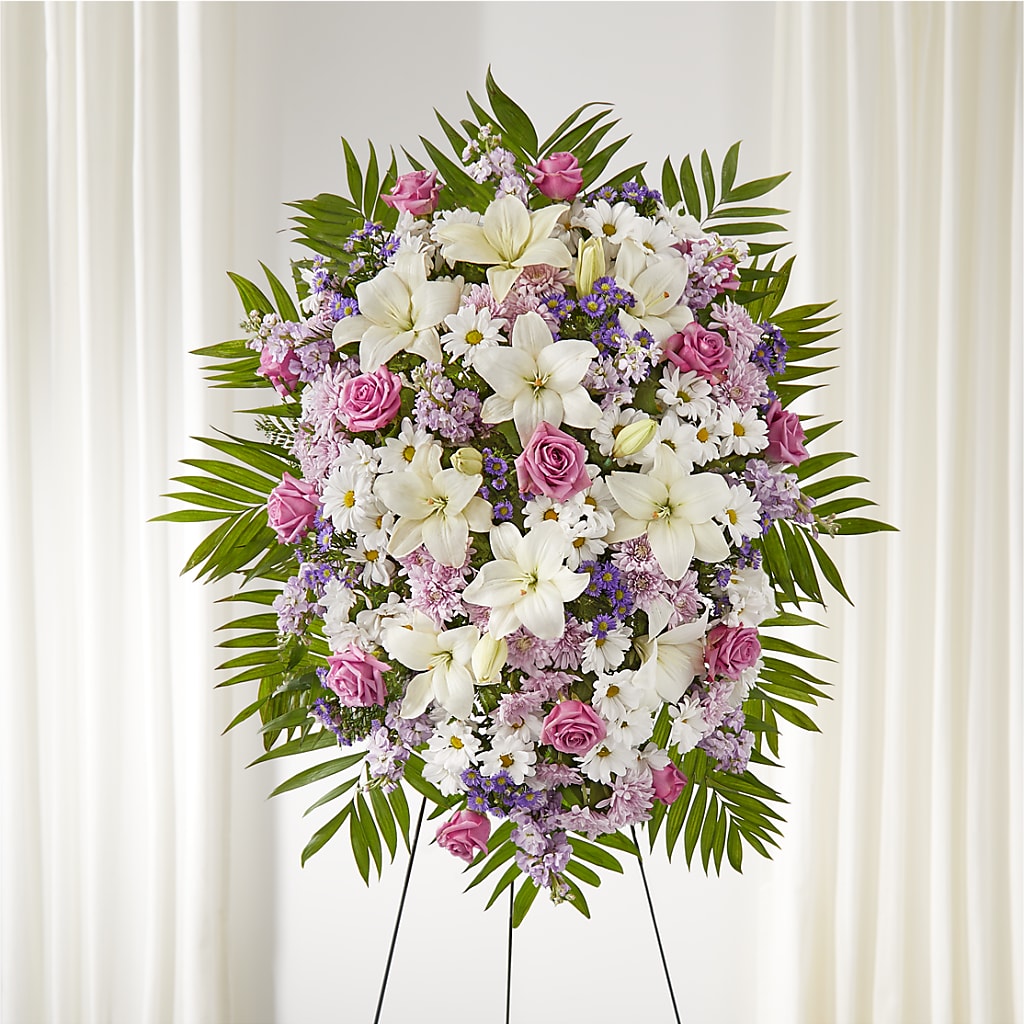 Envuélvalos en un hermoso abrazo en un momento de necesidad con un cálido y acogedor arreglo floral. Este arreglo floral, con un ingenioso diseño de flores blancas y lavanda, le da un toque especial al servicio de un ser querido.